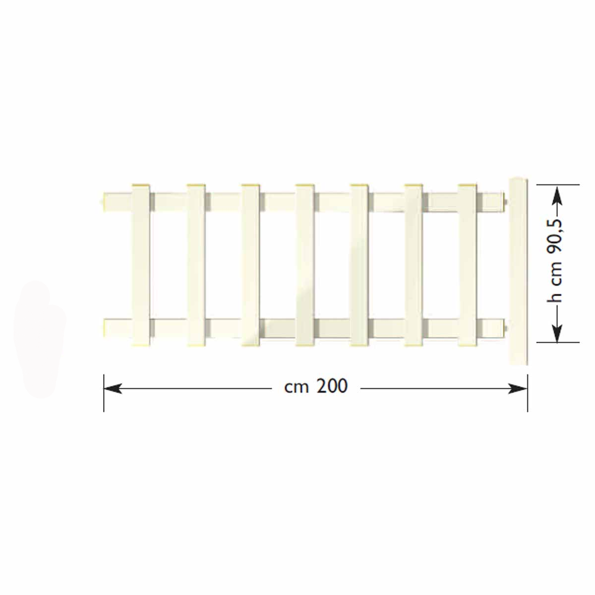 Liner 4/7 model fence with 7 vertical slats, 90.5 cm high, with flat caps and initial slats not adjacent to the support uprights.