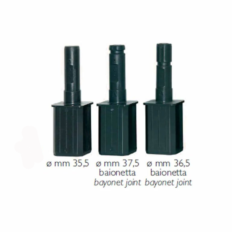 Square nylon reducer with metal reinforcement insert, with 35.5 - 37.5 mm bayonet and 36.5 mm bayonet diam. couplings (bayonets with double vertical windproof groove).